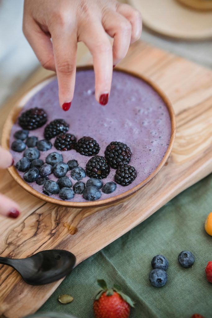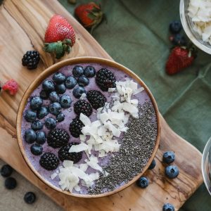 - Pour into a bowl and decorate with your chosen toppings—blueberries, blackberries, chia seeds, and coconut flakes.